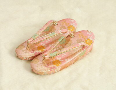 草履はかわいらしいピンク地色の織生地張りの判で高級感があります。