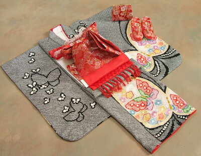 七五三 着物 7歳 着物セット 正絹総本鹿の子手絞り 黒地着物 赤地三色桜桐生織帯セット 舞蝶 足袋に腰紐など21点フルセット
